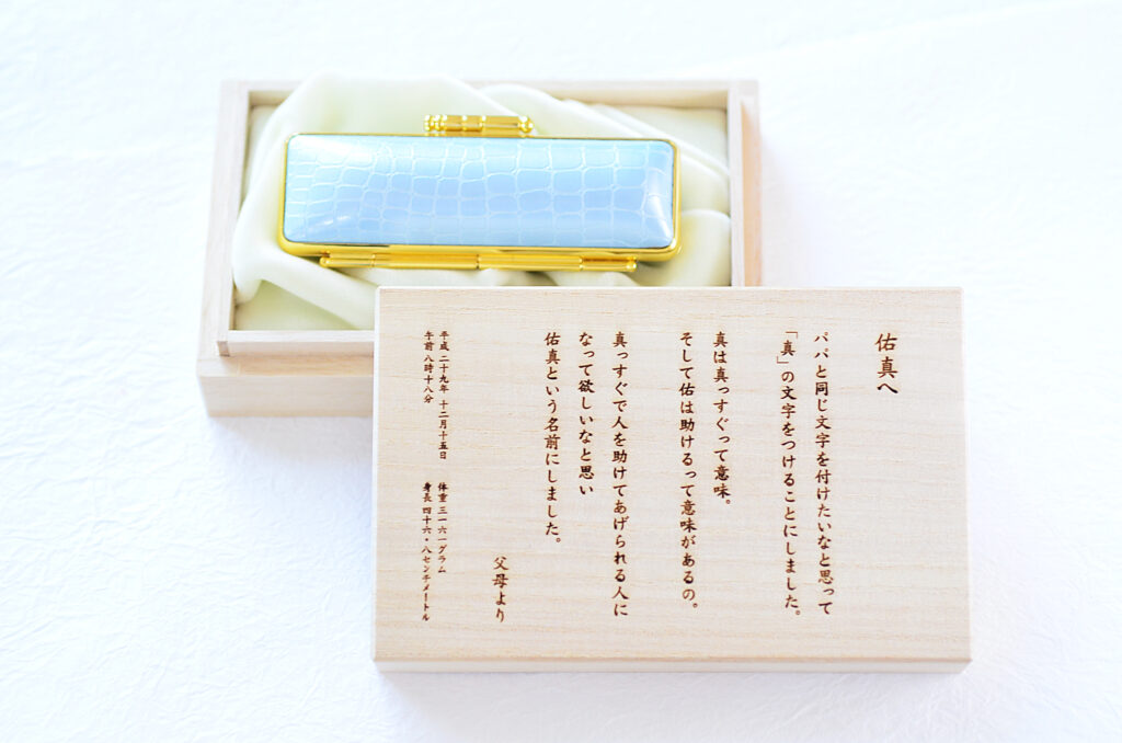 名前に込めた願いを刻み、20年後に印鑑や通帳と贈る「こまもり箱」