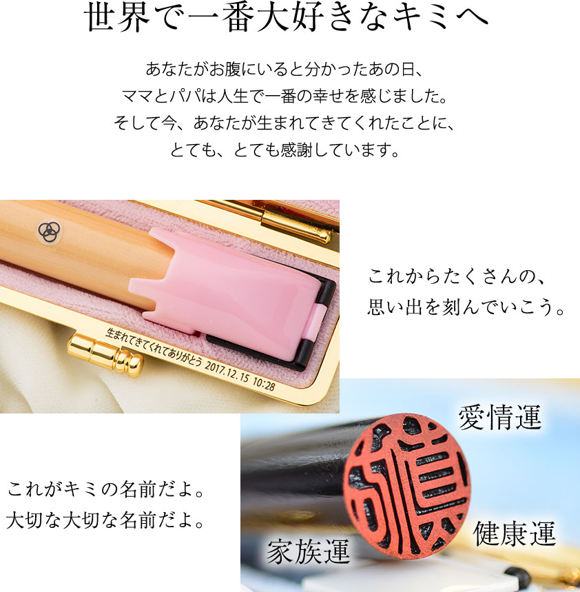 親御さんが名付けた大切なお名前の画数を拝見し、八方位の運気(愛情運、金運、健康運など)を強めてデザインする、世界にたったひとつの印鑑です。お子さまの幸せな未来への願いを、印鑑という「しるし」に込めることができます。